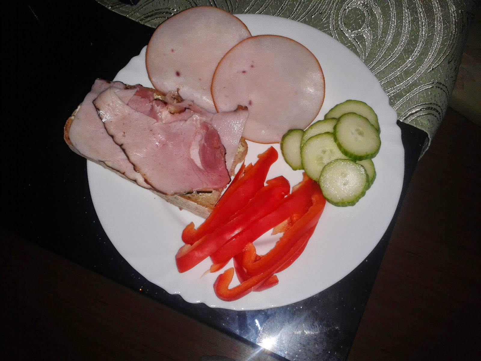 A taky mám ráda pečivo k večeři (že se to nemá? Pche!). Nejlepší křupavý chlebík z Kauflandu s debrecínkou a moravským uzeným a k tomu červená paprika s okurkou. Večeře po cvičení, která mi vyhovuje! :)